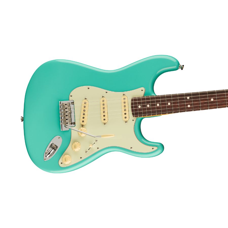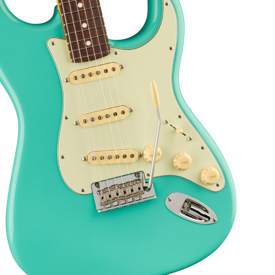 Our popular Deep “C” neck now sports smooth rolled fingerboard edges, a “Super-Natural” satin finish and a newly sculpted neck heel for a supremely comfortable feel and easy access to the upper register. New V-Mod II Stratocaster single-coil pickups are more articulate than ever while retaining bell-like chime and warmth. An upgraded 2-point tremolo with a cold-rolled steel block increases sustain, clarity and high-end sparkle.