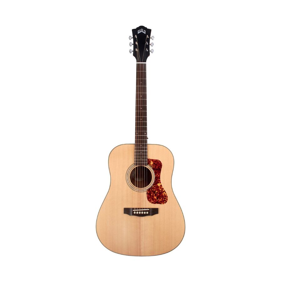 The D-240E Limited Flamed Mahogany acoustic guitar features the same full-bodied tone as the D-240E but boasts an exotic flamed mahogany back and sides, which are perfectly complemented by its solid Sitka spruce top. This Guild dreadnought provides guitarists with a classic acoustic sound and balanced voicing—and the arched back delivers great volume and projection, long sustain, and a lush, full sound. The D-240E Limited Flamed Mahogany also features a pau ferro fingerboard and bridge, a real bone nut and saddle, a mother-of-pearl rosette, a tortoiseshell pickguard, and a beautiful Natural satin finish. An integrated Fishman-designed GT-1 pickup system with Volume and Tone controls faithfully reproduces the guitar’s acoustic sound when it is amplified.