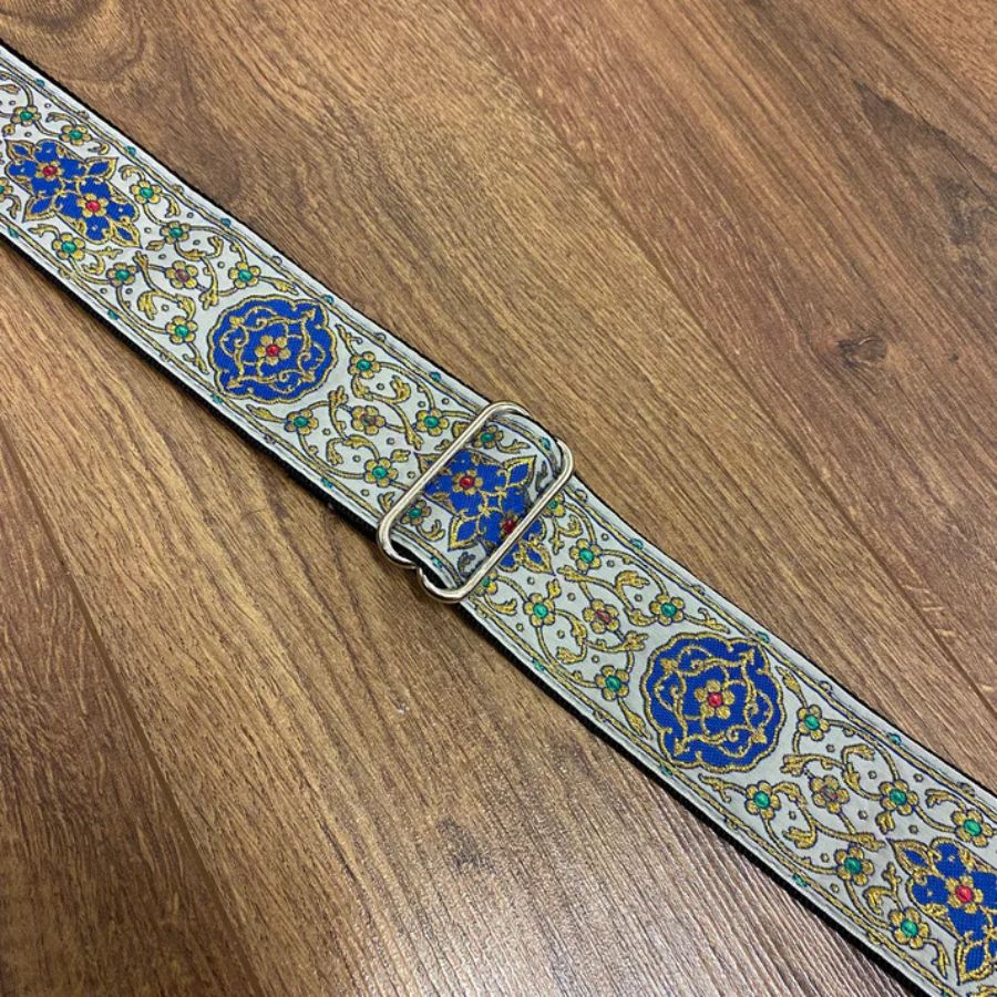 2” Grey/Blue/Gold Oranate Jacquard Ribbon Sewn on Tubular Webbing with Leather Ends.